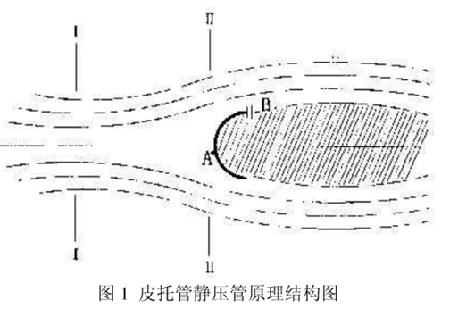 皮托管的測量原理是基于伯努利方程在空氣中應(yīng)用的一個實例,如圖1所示。當理想流體均勻的平行流向靜止物體時,設(shè)想其中一條撞在物體上(即圖1中的A點),在此處流體發(fā)生分岔,A點成為滯止或駐點,A的流速為零,V-A=0。