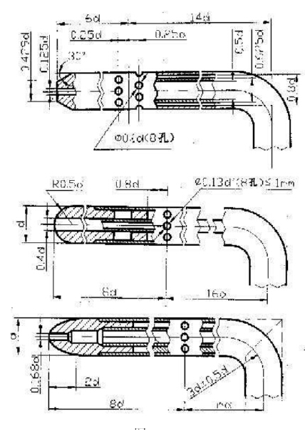 上圖是一般皮托管的結(jié)構(gòu),為了能看清,把兩端放大。如圖中可以看到皮托管外形是一個L型的金屬管,與管軸平行安置的直角邊是測頭,其頂端有一個總壓孔,在其側(cè)壁上有若干個靜壓孔。總壓孔與靜壓孔不相通,分別用導壓管引出,從靜壓孔至總壓孔稱為鼻端。直角的另一邊稱為支桿,引出總壓孔和靜壓孔的接頭以便與微壓計的管相連接。其上有定向桿,指示鼻端方向。測量總壓力的管子叫皮托管,測量靜壓力的管子叫靜壓管。實際上常用的都是皮托管和靜壓管的組合,而且多數(shù)使用實驗系數(shù)接近為1的形狀,也*是國際標準推薦的GETIAT(錐形頭)型,AMCA型(球形頭),MPL型(橢圓形頭三種),如下圖所示
