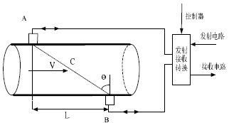 時差法計量的關(guān)鍵是要能夠獲得高精度的時間測量參數(shù),近幾年來,隨著高速時間計數(shù)處理芯片不斷出現(xiàn),使得幾十皮秒的測量精度變得可能,這對于時差法用于小口徑超聲波流量計提供了計量保證。圖1是時差法超聲波流量測量法的基本原理圖。