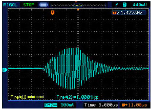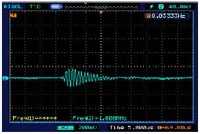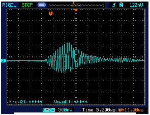在超聲波流量測量時,首先要對換能器進(jìn)行驅(qū)動,激勵換能器產(chǎn)生振蕩并發(fā)出超聲波信號,以下是分別采用1個驅(qū)動脈沖、10個驅(qū)動脈沖和15個驅(qū)動脈沖作為換能器的激勵源,圖2是1個驅(qū)動脈沖時,接收端換能器所接收到的波形??梢钥闯?,當(dāng)一個脈沖驅(qū)動時,所接收到的波形比較微弱,波形很不規(guī)范。圖3是10個驅(qū)動脈沖時,接收端換能器所接收到的波形。波形形狀得到明顯改善。圖4是15個驅(qū)動脈沖時,接收端換能器所接收到的波形。